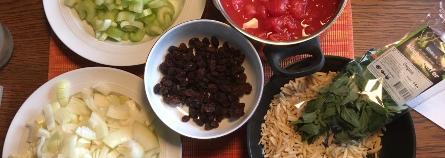 Wenn Sie damit durch sind, in der gleichen Pfanne die klein geschnittenen Zwiebeln mit einem Teelöffel Salz und einem Teelöffel Zucker (verhindert das Braunwerden der Zwiebeln und gibt einen wunderbar karamellisierten Geschmack) glasig anschwitzen. Dann erst den ebenfalls klein geschnittenen Staudensellerie und zum Schluss die Rosinen hinzugeben. Alles so lange bei mittlerer Temperatur erhitzen, bis sich die Rosinen mit dem Fett vollgesogen haben. Das Tomatenmark hinzufügen. Alles kurz darin schwenken. Dann sofort von der Platte nehmen. Die Rosinen dürfen durch das Braten nicht wieder schrumpelig und fest werden.