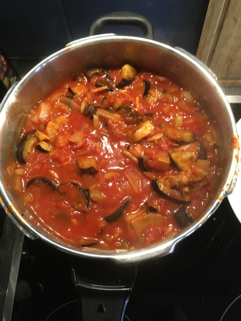 Dann mit den Tomaten auffüllen. Alles zusammen kräftig salzen und pfeffern und gut eine halbe Stunde sanft köcheln, dann Oregano und die frisch gehackte Petersilie hinzugeben und gern eine weitere halbe Stunde auf niedrigster Stufe weiterköcheln, bis alles gut durchgezogen ist.